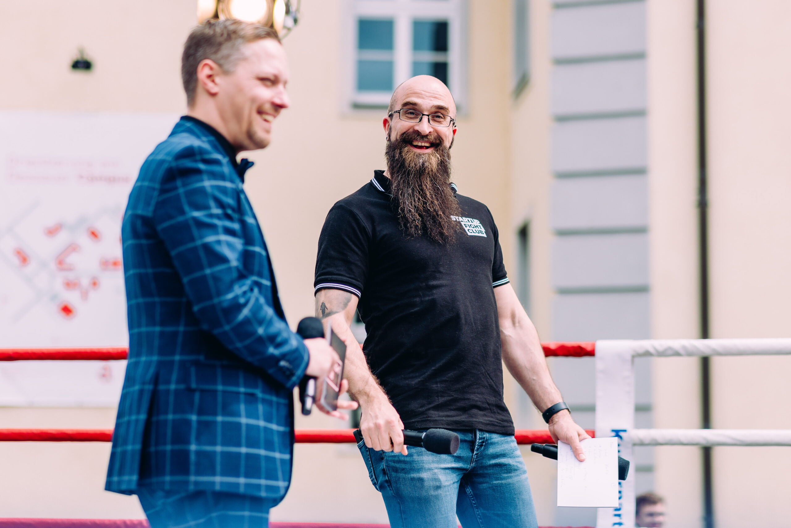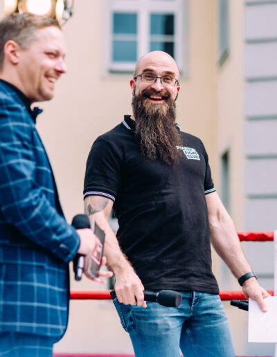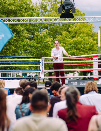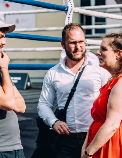 Nach dieser motivierenden Reflexion über Learnings, Mut und die Lust am Gründen erklang die Ringglocke und forderte Zuschauer, Ringrichter und Ringsprecher auf, ihre Plätze einzunehmen und den Kontrahenten die volle Aufmerksamkeit zu schenken. Beim Startup Fight Club traten diesmal 16 Teams im sportlichen Wettstreit in den Boxring – und gaben einen Einblick in Startup-Szene im Land – und darüber hinaus. Die kreativ vorgetragenen Pitches waren wieder von übergreifenden Themen geprägt und sehr gut moderiert von Marius Lauer und Fabius Gnauck. Die hochkarätigen Ringrichterinnen und Ringrichter konnten sehr kurzweilige Kämpfe beobachten – und bewerten.